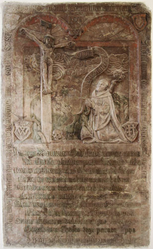 Dieser nachfolgend abgebildete Grabstein ist einer der ältesten im Raum, und er hat ein paar Besonderheiten. Die auf dem Rand umlaufende Inschrift lautet: "+ ANNO D(OMI)NI M CCC / .....WERNHARDUS MILES DE AISTERS/HAIM ET CLARA / UXOR EIUS M CCC LII XIII KAL IVNII". Die Inschrift heißt "CLARA" und nicht "altera", wie bei Ferdinand Wirmsperger: Aistersheim und seine Besitzer, 46 zu lesen ist, weiterhin steht dort "JUNII" und nicht "JULII", wie in den Mitteilungen der k. k. Centralcomm. N. F. III, LXIV zu lesen ist. Das Todesdatum für Wernhard von Aistersheim ist freigelassen, durch Nachweis an anderer Stelle (Totenbücher des Stifts Wilhering) läßt es sich zum 25.9. ergänzen, während sich für seine Frau Clara der 20.5.1352 ergibt. Wernhard überlebte also seine Frau, hatte nur anläßlich des Todes seiner Frau den gemeinsamen Stein vorbereitet, und ein Nachtragen seines eigenen Todestages unterblieb. Er muß seine Frau aber eine ganze Weile überlebt haben, weil er noch 1379 urkundlich auftaucht, als Bruder eines Heinrich von Aistersheim. Der Schild der Herren von Aistersheim ist von Silber und Schwarz geteilt und zweimal gespalten, auf dem Helm mit schwarz-silbernen Decken ein halber Flug in den Teilungen und Farben des Schildes (Siebmacher Band: BayA1 Seite: 65 Tafel: 65, Band: OÖ Seite: 708 Tafel: 1). Die Angabe von Wirmsperger, Wernhardus sei zweimal vermählt gewesen, ist unzutreffend und beruht auf seiner fehlerhaften Lesung der Inschrift.