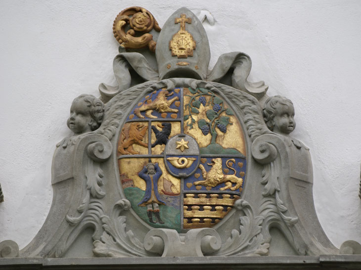 Auf dem oberen Rand der ovalen Kartusche ruht die Mitra des Abtes, bei der ein Detail bemerkenswert ist: Sie ist belegt mit einem flachen goldenen Reliquiar mit kaiserkronenförmiger Mitte, aus dem oben Christus am Kreuze hervorwächst. Das ist die Heilig-Blut-Reliquie des Klosters Weingarten, mehr zu ihr im Kapitel zum Gasthaus Zum Löwen. Es war dieser Abt Sebastian Hyller, der die Reliquie im Jahre 1726, also mehrere Jahre nach diesem Bau, neu in Gold und mit Edelsteinbesatz fassen ließ. Hinter der Mitra ragt schrägrechts der Krummstab des Abtes hervor. Hier fehlt noch das Schwert, das wir ein paar Jahre später an der Kirchenfassade sehen, wobei das Schwert bereits kurz nach der Anbringung zu Diskussionen um seine Berechtigung und die Reichsfreiheit der Abtei führte. Das Wappen im Fresko des Langhauses der Klosterkirche ist ohne dieses Schwert gemalt worden, dasjenige in Friedrichshafen ist mit Schwert ausgeführt.