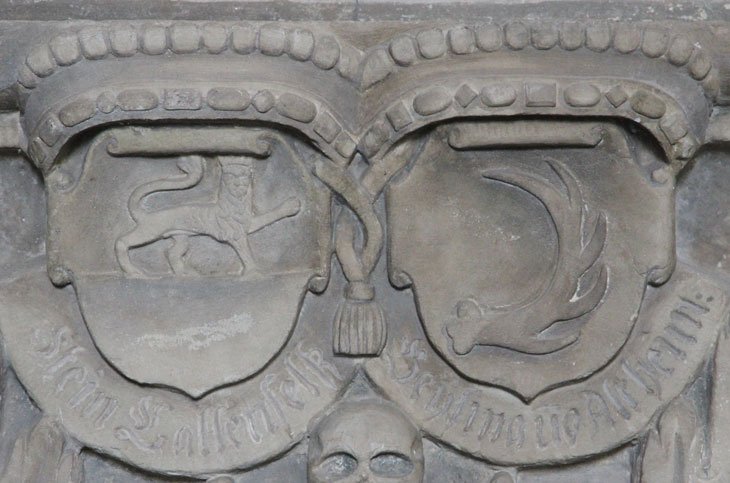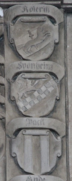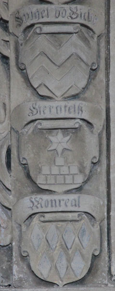 Kommen wir zurück zu Juliana Magdalena von Kötteritz, für die dieses Grabmonument eine ausführliche Ahnenprobe aus insgesamt 16 Ahnenwappenschilden enthält, angeordnet in Gruppen zu je 8 Schilden an den beiden Seiten. Auf der Schwertseite befindet sich die väterliche Stammlinie. Der Vater war Johann Heinrich von Kötteritz (1595-18.12.1648), die Großeltern waren väterlicherseits Hermann von Kötteritz, zuerst am Hofe des Herzogs von Pfalz-Simmern, dann Rat bei den Pfalzgrafen von Veldenz-Lauterecken, und Katharina Elisabeth von Sponheim gen. Bacharach; die Urgroßeltern waren Wolfgang von Kötteritz, Kanzler des Fürstentums Pfalz-Neuburg unter Herzog Wolfgang von Pfalz-Zweibrücken, und Brigitta von Pack sowie ein Herr von Sponheim gen. Bacharach und eine Frau von Ende. Entsprechend sehen wir von oben nach unten die Wappenschilde für die Familien von Kötteritz (gewendet, wie oben), von Sponheim gen. Bacharach (gewendet, in Gold ein in zwei Reihen silbern-schwarz geschachter Schrägrechtsbalken, darüber ein gekrönter schreitender roter Löwe), von Pack (in Silber zwei rote Pfähle), von Ende (gewendet, in Gold ein aufspringender schwarzer Wolf), von Allenbach/Ellenbach (rot-silbern geschacht mit rotem Freiviertel, darin eine silberne Lilie), von Spiegel (in Silber zwei rote Doppelsparren oder Zickzackbalken), von Sternenfels (in Silber auf einem blauen Stufengiebel ein sechsstrahliger roter Stern) und von Monreal (in Gold sieben (4:3) jeweils balkenweise aneinandergereihte schwarze Rauten). Entsprechend der Heimat der Familie Kötteritz finden wir hier einige Vorfahren, deren Familien im Raum Sachsen beheimatet sind.