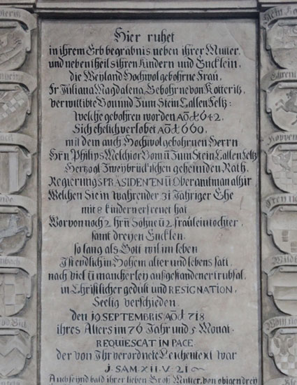 Die Inschrift im Zentralfeld lautet: "Hier ruhet / in ihrem Erbbegräbnis neben ihrer Mutter, / und nebentheils ihren Kindern und Encklein, / die Weyland Hochwo(h)lgebohr(e)ne Frau, / Fr(au) Juliana Magdalena Gebohr(e)ne von Kotteritz, / verwittibte Von und Zum Stein CallenFeltz: / welche gebohren worden A(NN)O 1642, / Sich ehelich verlobet A(NN)O 1660, / mit dem auch Hochwo(h)lgebohr(e)nen Herrn / H(er)rn Philip(p)s Melchior Vom u(nd) Zum SteinCallenFeltz / Hertzogl(ich) Zweybrückischen geheimden Rath. / RegierungsPRÄSIDENTEN u(nd) Oberamtman(n) alhi(e)r / Welchen Sie in wahrender 21 Jähriger Ehe / mit 8 kindern erfreuet hat / Worvon noch 2 h(er)r(e)n Söhne u(nd) 2 fräulein töchter. / samt dreyenb Encklen. / so lang als Gott wil(l) im leben / Ist endlich in Hohem alter und lebens satt, / nach viel u(nd) mancherley außgestandener trübsal, / in Christlicher gedult und RESIGNATION, / Seelig verschieden, / den 19. SEPTEMBRIS A(NN)O 1718 / ihres Alters im 76 Jahr und 5. Monat. / REQUIESCAT IN PACE. / der von Ihr verordnete Leichentext war / I. SAM. XII. V: 21". Danach wurde ergänzt: "Auch seynd bald ihrer lieben Groß Mutter, von obigen drey / Encklen zwey nachgefolget, u(nd) an den Kinderblatteren verstor/ben Anna Juliana vom u(nd) zum Stein Callenfeltz gebohren den 16 / Jan(uarii) 1711 Seel(iglich) Gestorben den 14 NOU(EMBRIS) 1718 u(nd) Joh(ann) Carl von u(nd) / Zum Stein Callenfeltz geb(oren) den 10 April 1713 Seel(iglich) g(e)st(orben) den 22. / NOU(EMBRIS) 1718 beide Carl Casimirs von u(nd) Zum Stein Callenfeltz / u(nd) Magdalena Saloma gebohr(e)ner Geyling von Altheim liebe / Kinder / RESVRGENT IN GLORIA". Der genannte Leichentext war: "Folget nicht dem Eitlen nach, denn es nützt nicht und kann nicht erretten". Der abschließende Satz bedeutet: "Sie werden auferstehen in Herrlichkeit".