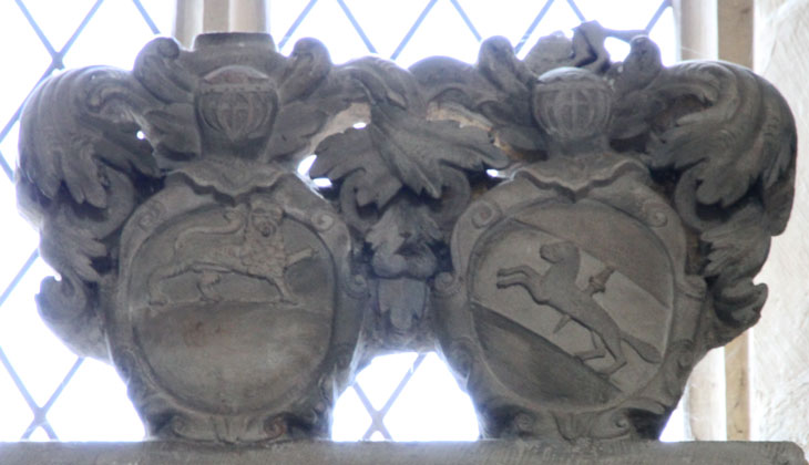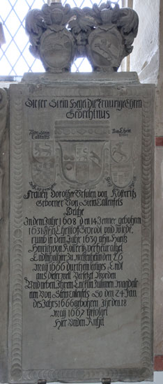 Fehlplaziert: Dieser Aufsatz mit dem Doppelwappen gehört nicht zu diesem Grabmonument, sondern zu dem links daneben. Es zeigt heraldisch rechts das gewendete Wappen der von Steinkallenfels, grün-golden geteilt, oben schreitend ein silberner, hersehender Löwe. Die hier zerstörte Helmzier wäre zu rot-silbernen Decken eine hahnenfederbesteckte hohe rote Spitzmütze, deren grüner Stulp mit einem schreitenden, hersehenden silbernen Löwen belegt ist. Das Wappen gegenüber zeigt das Wappen der von Kötteritz, in Gold ein silberner, mit einem roten, laufenden Wolf, dessen Leib schräglinks von oben nach unten (normalerweise andersherum, von unten nach oben) mit einem Schwert durchstochen ist, belegter Schrägbalken. Die hier zerstörte Helmzier wäre zu rot-silbernen Decken ein aufspringender, roter Wolf, dessen Leib schräg mit einem Schwert durchstochen ist. Mit dieser Kombination, die für die Ehe zwischen Dorothea Ursula von Steinkallenfels (14.1.1608-26.5.1666) und ihrem zweiten Mann Johann Heinrich von Kötteritz (1595-18.12.1648) steht, wechseln wir über zum optisch linken der beiden Grabdenkmäler für die einzige Tochter aus besagter Verbindung, Juliana Magdalena von Kötteritz (1642-19.9.1718). Dieses Monument überragt dasjenige ihrer Mutter, und wenn wir uns das Wappenpaar noch zusätzlich auf dem Aufsatz vorstellen, sogar deutlich.