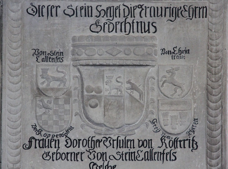 Die Fraktur-Inschrift im Zentralfeld lautet: "Dieser Stein Heget die Traurige Ehren / Gedechtnus / Frauen Dorothee Vrsulen von Kötteritz / Gebor(e)ner Von SteinCallenfels / Welche / In dem Jahr 1608 den 14 Jenner gebohren / 1631 Ahn Christoff von Grorodt vnd wiede=/rumb in dem Jahr 1639 ahn Hanß / Henrich von Kötteritz verheurathet / Endlich alhier Zu Meisenheim den 26 / May 1666 durch ein seeliges Endt / aus dieser welt Versetzet worden / Vnd neben Ihrem Encklin Julianen Magdale/nen von SteinCallenfels So den 24 Jan(uarii) / des Jahrs 1666 gebohren Ihr den 18 May 1667 gefolget / Hier Vnden Ruhet". Aus dieser Inschrift geht hervor, daß hier nicht nur Dorothea Ursula von Steinkallenfels selbst, sondern auch ihre als Kleinkind verstorbene Enkelin Juliana Magdalena von Steinkallenfels (24.1.1666-18.5.1667) beerdigt wurde. Die nachfolgend beschriebenen Wappen beziehen sich aber allein auf die Erstgenannte. Man mag verwundert sein, daß diese Enkelin den Namen Stein-Kallenfels trägt, aber Dorothea Ursulas einzige Tochter, Juliana Magdalena von Kötteritz, heiratete 1660 ihren Cousin Philipp Melchior von Steinkallenfels, der als Pfalz-Zweibrücker Oberamtmann in Meisenheim tätig war und gerne die vermögende Erbtochter heimführte, welche den umfangreichen Graerodtschen und Kötteritzschen Besitz mitbrachte, und aus dieser Verbindung entsproß Juliana Magdalena von Steinkallenfels.