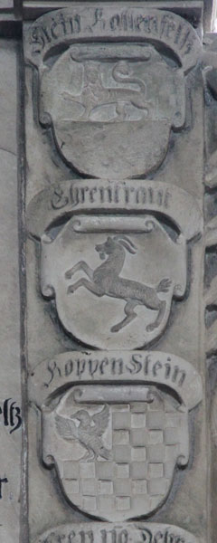 Rechts und links dieses zentralen, zweifachen Ehewappens sind insgesamt vier Ahnenwappen reliefiert, die sämtlich inschriftlich zugeordnet sind. Heraldisch rechts oben sehen wir erneut den Schild der von Steinkallenfels ("Von Stein / Callenfels"), grün-golden geteilt, oben schreitend ein silberner, gekrönter Löwe. Das steht für ihren Vater, Melchior von Steinkallenfels, und den Großvater väterlicherseits, Hans Melchior von Steinkallenfels. Gegenüber sehen wir das Wappen ihrer Mutter, Elisabeth von Irmtraut (auch: von Irmtraud, von Ermtraut, hier "Von Ehrin / traut"), in Silber ein schwarzer, aufspringender Bock. Ihre Mutter war die zweite Ehefrau ihres Vaters; in erster Ehe hatte dieser davor eine Frau von Graerodt geheiratet. Heraldisch rechts unten folgt in der Ahnenlogik auf Platz 3 das Wappen für die Großmutter väterlicherseits, Antoinette/Antonia aus der Familie der von Koppenstein ("Der Koppenstein"), blau-golden geschacht mit einem roten Freiviertel, darin ein schwarzer Rabe, eine Ableitung vom Sponheimer Wappen. Und als letztes folgt links unten auf Platz 4 das Wappen für die Großmutter mütterlicherseits aus der Familie Frey von Dehrn ("Frey von Theren"), unter goldenem Schildhaupt in Blau drei (2:1) goldene Korngarben.
