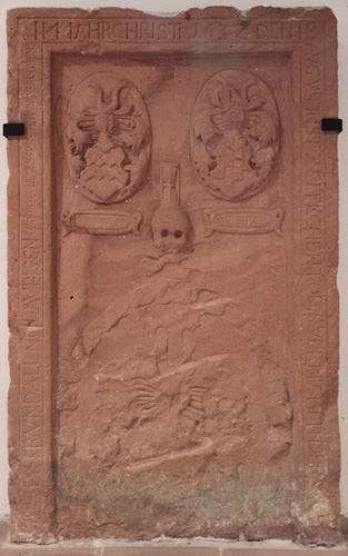 Die hier vorgestellte Platte war lange im Boden der Kirche verborgen und wurde erst Anfang des 20. Jh. wiederentdeckt. Die Zweitverwendung erklärt die starken Beschädigungen. Die ursprünglich auf allen vier Seiten umlaufende Inschrift ist nur noch auf drei Seiten lesbar erhalten und lautet: "IM IAHR CHRISTI 1632 DEN 18 / AVGVSTI IST ZEITLICHEN TODTS VERBLICHEN DER WO(H)LE(DLE).... / ... / ... DI(E)SER VND ALLEN GLAVBIGEN EIN(E) FROE(H)LICHE AVFFERSTEHVNG VERLEIHEN". Offensichtlich hat man sich im Platzbedarf verschätzt, denn auf dem letzten Teilstück geht es nach dem Wort "GLAVBIGEN" mit erheblich reduzierter, geradezu halbierter Schriftgröße weiter für den Rest des Textes. Genau das entscheidende Stück mit der Namensnennung fehlt, aber da die beiden Wappen im Zentralfeld namentlich mit der Bezeichnung "GEISSPITSHEIM" = von Geispitzheim und "KOPPENSTEIN" = von Koppenstein zugeordnet sind, erlaubt sich zusammen mit den Lebensdaten eine Identifizierung des Verstorbenen als Wolf Michael von Geispitzheim (-18.8.1632). Im unteren Bereich des Zentralfeldes war früher einmal das Vollwappen des Verstorbenen; es ist bis zur Unkenntlichkeit zerstört. Deshalb sind die beiden erhaltenen Wappen eine Ahnenprobe auf Elternebene.