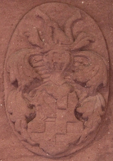 Das Wappen der von Geispitzheim zeigt in Silber drei rote Zickzackbalken, oder wie hier fünfmal im Zickzackschnitt silbern-rot geteilt, auf dem Helm mit rot-silbernen Decken zwei wie der Schild bezeichnete Büffelhörner, wobei die Zickzackteilungen hier nicht mehr aufgelöst sind. Das Wappen der von Koppenstein ist blau-golden geschacht mit einem roten Freiviertel, darin ein Vogel (nach Gruber ein schwarzer Rabe, nach Siebmacher ein silberner Vogel), auf dem Helm mit blau-goldenen Decken der Vogel zwischen zwei blau-golden geschachten Büffelhörnern, wobei hier die Details nicht aufgelöst sind. Bei den Koppensteinern gibt es noch andere Varianten, vgl. bei Zobel. Unten zwischen den beiden Wappen sieht man als Memento mori eine Sanduhr auf einem Totenschädel.