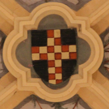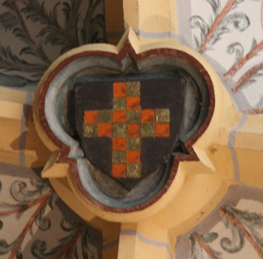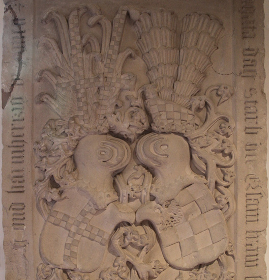 Wer das Wappen der Herren und späteren Grafen von Ingelheim in Farbe sehen möchte, findet zwei davon auf den Gewölbeschlußsteinen, wo die Revolutionäre nicht zum Abschlagen drankamen.