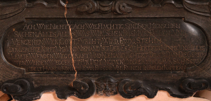 Ganz unten im Sockelbereich befindet sich eine weitere Inschrift des Wortlauts "ACH, WIE, NICHTIG ACH, WIE, FLVCHTIG, SIND, DER, MENSCHEN / SACHEN, ALLES, ALLES, WAS, WIR, SEHEN, DAS, MVS, FALLEN, VND, / VERGEHEN, WER, GOTT, FVRCHT, WIRD, EWIG, STEHEN / DER, GERECHTE, KOMPT VMB, VND, NIEMAND, IST, DER, ES, ZV, HERTZEN, NEHME, VND, HEILIGE / LEVTE, WERDEN, WEGGERAFT, VND, NIEMAND, ACHTET, DRAVF DAN, DIE, GERECH : / TEN, WERDEN, WEGGERAFT, FVR, DEM, VNGLVCK, VND, DIE, RICHTIG, FVR SICH GEWA: / NDELT, HABEN, KOMMEN, ZVM, FRIEDE, VND, RVHEN, IN, IHREN, KAMMERN.", ein allgemeines Wehklagen über die Vergänglichkeit, in der man für den ersten Teil eine Quelle in der 13. Strophe eines von Michael Franck geschriebenen Kirchenliedes findet, und deren zweiten Teil seine Wurzeln in Jesaja 57, Vers 1-2 hat: "Der Gerechte ist umgekommen und niemand ist da, der es zu Herzen nimmt, und fromme Leute sind hingerafft und niemand achtet darauf, denn der Gerechte ist weggerafft durch die Bosheit und geht zum Frieden ein. Es ruhen auf ihren Lagern, die recht gewandelt sind".