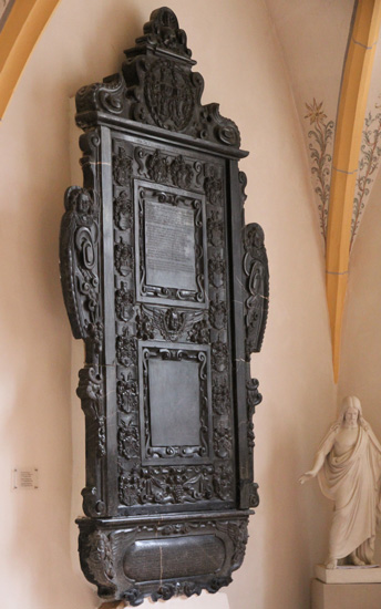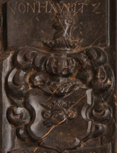 Abb. rechts: Wappen der Position 12: Herren von Haubitz ("VON HAVBITZ"), eine ursprünglich meißnische Familie, die sich später auch in Masuren niederließ, eines Stammes mit den von Haugwitz mit ähnlichem Wappen, erloschen Ende des 18. Jh., in Rot ein schwarzer, golden gekrönter Widderkopf, auf dem Helm mit schwarz-silbernen Decken ein gekrönter schwarzer Widderkopf. Das Wappen wird beschrieben im Siebmacher Band: PrA Seite: 25 Tafel: 19, unter folgender Ergänzung: Die Krone des Kleinods ist noch mit drei Straußenfedern in den Farben blau-silbern-rot besteckt, und die Decken sind rot und schwarz. Im Rietstap wie folgt: "de gueules à un rencontre de bélier de sable, accordnée d'or, cimier une tête et col de bélier de sable, accornée d'or, sommée de trois plumes d'autruche, d'azur, d'argent et de gueules, lambrequins de gueules et de sable (branche de la famille de Haugwitz)". Es fällt auf, daß Rietstap keine Krone erwähnt, dafür die Hörner als golden beschreibt, und daß im Siebmacher die Abbildung das genau so zeigt, in Widerspruch zum Text. Hier am Epitaph sind zwar keine Tinkturen zu erkennen, aber die Krone.