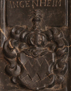 Abb. Mitte: Wappen der Position 10: Herren von Ingenheim ("INGENHEIM") aus dem elsässisch-lothringischen Raum, in Silber ein schwarzer Zickzackbalken, auf dem Helm mit schwarz-silbernen Decken ein silberner hoher Hut, belegt mit einem schwarzen Zickzackbalken, oben eine silberne Kugel mit schwarzen Hahnenfedern (Siebmacher Band: Els Seite: 12 Tafel: 14, OÖ Seite: 633 Tafel: 129). Eine Metzer Linie wurde reichsfreiherrlich und verzweigte sich auch nach Bayern. 1807 erlosch die echte Familie im Mannesstamm. Eine Kuriosität am Rande: Das Wappen und der Name wurden 1821 neu vergeben, an den Rechtswissenschaftler Johann Nepomuk Wening (15.11.1790-16.10.1831), der 1821 als von Wening-Ingenheim in den Adelsstand erhoben wurde. Sein Wappen ist geviert mit Herzschild, Feld 1 und 4: in Silber ein roter Greif, Feld 2 und 3: in Blau ein silberner Stern, gekrönter Herzschild: in Silber ein dreimal eckig gezogener schwarzer Balken (Zickzackbalken). Helm 1 (rechts): auf dem gekrönten Helm mit blau-silbernen Decken drei Straußenfedern, eine blaue zwischen zwei silbernen, Helm 2 (links): auf dem gekrönten Helm mit schwarz-silbernen Decken ein silberner Spitzhut, oben mit zwei schwarzen Hahnenfedern besteckt, belegt mit einem dreimal eckig gezogenen schwarzen Balken (Siebmacher Band: Bad Seite: 137 Tafel: 80, Band: Bö Seite: 267 Tafel: 123, Band: Bay Seite: 123, Band: OÖ Seite: 633 Tafel: 129. Der Herzschild und Helm 2 wurden dabei 1:1 von den ausgestorbenen Frhr. von Ingenheim übernommen.