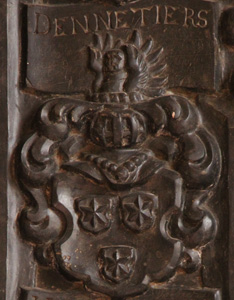 Abb. rechts: Wappen der Position 11: Familie d'Ennetières ("DENNETIERS") aus Belgien bzw. genauer der Gegend von Tournai, nicht zu verwechseln mit den D'Ennetières et des Mottes en D'Ennetières d'Hust aus den südlichen Niederlanden, in Silber drei (2:1) blaue Schildchen, die jeder mit einem goldenen Stern belegt sind, auf dem Helm hier ein wachsender Rumpf ohne erkennbare Gesichtsdetails zwischen einem Flug, nach Rietstap die Helmzier anders, nämlich ein wachsender natürlicher Tiger zwischen einem blauen Flug: "d'argent à trois écussons d'azur, chargé chacun d'une étoile (5) d'or, casque couronné, cimier un tigre issant au naturel, coll. et enchainé d'argent, entre un vol à l'antique d'azur".