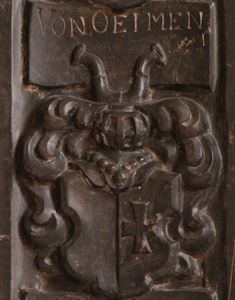 Abb. links: Wappen der Position 13: ("VON OEIMEN"), ungeklärt, vermutlich eine belgisch-niederländische Familie, das Wappen ist gespalten, rechts ledig, links ein Tatzenkreuz, auf dem Helm ein Paar geteilter Büffelhörner.