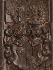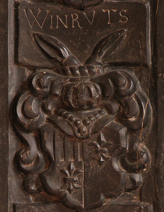 Abb. Mitte: Wappen der Position 15: ("WINRVTS"), ungeklärt, vermutlich eine belgisch-niederländische Familie, das Wappen ist geviert, Feld 1: drei Pfähle, Feld 2 und 3: eine Lilie, Feld 4: ledig, auf dem Helm zwei Eselsohren.