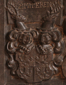 Abb. rechts: Wappen der Position 17: Herren und spätere Grafen von Zimmern ("ZIMMEREN") aus Schwaben, geviert, Feld 1 und 4: in Blau einwärts ein goldener, rotgezungter Löwe mit einer hier fehlenden silbernen, rot gestielten Hellebarde oder Partisane in den Pranken (Stammwappen der Herren von Zimmern), Feld 2 und 3: in Silber einwärts ein roter Löwe (Herrschaft Wildenstein), zwei Helme, Helm 1 (rechts): zu rot-goldenen Decken ein wachsender roter Hirschrumpf mit goldenem Geweih und roter Zunge (Stammhelm Zimmern), Helm 2 (links): zu rot-silbernen Decken ein wachsender roter Hirschrumpf mit silbernem Geweih und roter Zunge (Herrschaft Wildenstein). Das Wappen wird beschrieben im Siebmacher Band: WüA Seite: 112 Tafel: 62, im Alberti S. 110 und im Münchener Kalender 1935.