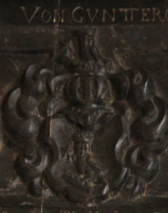 Abb. links: Wappen der Position 2: von Günderrode ("VON GVNTTERODT"), eine zum Frankfurter Patriziat gehörende, auch in der Stammheimat Thüringen, in Leipzig und in Kassel vorkommende Adelsfamilie, in Blau auf einem goldenen Ast sitzend eine naturfarbene Eule, im rechten Obereck begleitet von einem goldenen Stern, auf dem gekrönten Helm mit blau-goldenen Decken auf einem goldenen Ast sitzend eine naturfarbene Eule. Die Familie stellte mehrere Juristen und Hofbeamte. Der Frankfurter Zweig der Familie geht auf Tilemann von Günderrode zurück, der Kanzler am Hof des Landgrafen von Hessen-Kassel war. Dessen Sohn Rudolf von Günderrode (1547-1601) heiratete Margarethe von Holzhausen (1567-1616), und dadurch kam die Familie nach Frankfurt. Im Jahre 1588 wurden die von Günderrode in die Ganerbschaft Alten-Limpurg in Frankfurt aufgenommen, seit 1610 sind sie Reichsfreiherren.