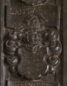 Abb. rechts: Wappen der Position 5: Familie de Landas ("LANTDAS") aus Brabant, mit fünf Spitzen silbern-rot gespalten, auf dem bewulsteten Helm hier ein wachsender Steinbocksrumpf mit Halsband. Französischer Blason: Parti-émanché d'argent et de gueules de dix pièces. Alternativ nur: émanché d'argent et de gueules de dix pièces. Das Wappen wird im Rietstap gelistet, und dort wird als Kleinod angegeben: "un bouc issant d'hermine, entre un vol de sable, lambrequins de gueules et d'hermine." Soweit passend mit dem Bock, nur im Vergleich dazu fehlt in der hiesigen Darstellung der Flug. Die vier Kilometer von der Grenze zu Belgien entfernt gelegene nordfranzösische Gemeinde Landas führt diesen Schild heute.