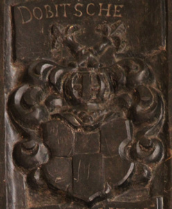 Abb. links: Wappen der Position 8: von Döbitzheim (?) ("DOBITSCHE"), ungeklärt, Schild geteilt und zweimal gespalten vermutlich in verwechselten Farben, auf dem Helm zwei schräggekreuzte Schäfte mit je drei Federn am oberen Ende. Genealogien der Familie Günderrode (Frankfurter Patrizier) weisen auf die Einheirat einer Frau von Döbitzheim hin, wobei sich diese Familie in keiner Standardwappensammlung verifizieren läßt.