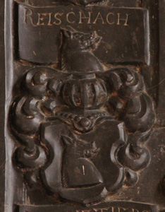 Abb. Mitte: Wappen der Position 9: Herren von Reischach ("REISCHACH") aus Schwaben, in Silber ein schwarzer, rotgezungter Eberkopf mit Hals, goldenen Hauern und mit goldenen Rückenborsten, auf dem ungekrönten Helm mit schwarz-silbernen Decken ein silberner, rotgezungter, golden bewehrter Eberkopf mit Hals und mit einem Kamm goldener Rückenborsten. Das Wappen wird beschrieben im Siebmacher: Band: Bad Seite: 23 Tafel: 15, Band: NÖ1 Seite: 375 Tafel: 208, Band: OÖ Seite: 293 Tafel: 78, Band: Pr Seite: 321 Tafel: 375, Band: PrA Seite: 68 Tafel: 50, im Kindler OB 3: S. 427 ff. (bis S. 455) etc.