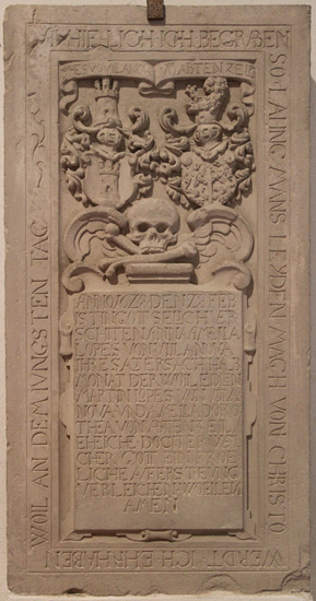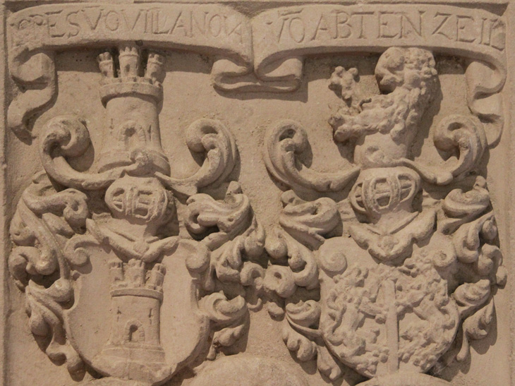 Im oberen Teil des Zentralfeldes befinden sich über dem Memento mori in Form eines Totenschädels zwischen zwei Flügeln über gekreuzten Knochen das elterliche Allianzwappen, heraldisch rechts das Vollwappen der Lopes de Villanova ("LOPES VO(N) VILLANOVA"), in Rot ein silberner Zinnenturm mit Tor und zwei schießschartenartigen Fenstern und mit drei kleinen Türmchen auf der Wehrplattform, auf dem Helm mit blau-silbernen Decken der silberne Zinnenturm wie im Schild. Hier ist der Zinnenturm erheblich aufwendiger dargestellt als auf dem großen schwarzen Villanova-Epitaph. Auf der anderen, heraldisch linken Serite sehen wir das Wappen der aus dem schweizerischen St. Gallen stammenden Familie Appenzeller ("VO(N) ABTENZELL"), golden-blau geviert mit zwei gegeneinander aufspringenden Löwen in verwechselten Farben, auf dem Helm mit blau-goldenen Decken ein wachsender goldener Löwe. Es scheint, als würden die beiden Löwen einen mittig positionierten Stab im Schild anspringen, doch das täuscht, tatsächlich ist hier nur die Spaltlinie des eigentlich gevierten Wappens verdickt dargestellt worden.