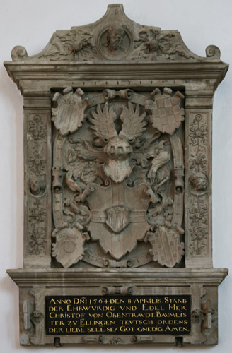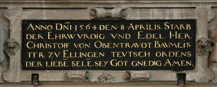 Die Inschrift nennt den Verstorbenen, Christoph von Obentraut, in golden gefaßter Kapitalis aus schwarzem Schiefergrund wie folgt: "ANNO D(OMI)NI 1564 DEN 8 APRILIS, STARB / DER EHRWV(E)RDIG VND EDEL, HER(R) / CHRISTOFF VON OBENTRAVDT, BAVMEIS=/TER ZV ELLINGEN TEVTSCH ORDENS, / DER LIEBE(N) SELE(N), SEY GOT(T) GN(A)EDIG AMEN." Christoph von Obentraut (-8.4.1564) war also Mitglied des Deutschen Ordens, und er war Ordensbaumeister in der Landkommende Ellingen, dem Sitz des Landkomturs der Ballei (Ordensprovinz) Franken. Rein zeitlich paßt seine Tätigkeit dort dazu, daß diese Kommende 1552 niedergebrannt worden war und wiederaufgebaut werden mußte. Entsprechend seiner Mitgliedschaft in diesem geistlichen Ritterorden war er katholisch und unverheiratet, und er unterlegte sein eigenes Wappen, hier im Zentrum des Hauptfeldes, mit dem Deutschordenskreuz: In Silber drei rote Pfähle unter einem mit drei goldenen Lilien belegten blauen Schildhaupt, unterlegt von einem silbernen Rückschild mit einem durchgehenden schwarzen Kreuz, auf dem Helm mit blau-silbernen Decken ein beiderseits wie der Schild bezeichneter Flug.