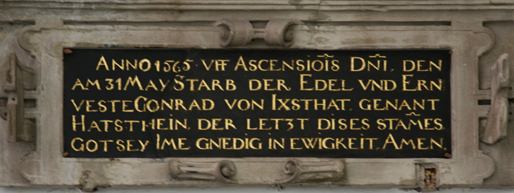 Die Inschrift nennt den Verstorbenen, Conrad von Igstatt (Igstadt) gen. Hattstein (Hatzstein), in golden gefaßter Kapitalis aus schwarzem Schiefergrund wie folgt: "ANNO 1565 VFF ASCENSIO(N)IS D(OMI)NI, DEN / AM 31 MAY STARB DER EDEL VND ERN:/VESTE CONRAD VON IXSTHAT, GENANT / HATSTHEIN, DER LETZ(E)T DI(E)SES STAM(M)ES, / GOT(T) SEY I(H)ME GN(A)EDIG IN EWIGKEIT, AMEN." Ascensionis Domini meint Christi Himmelfahrt, was immer 39 Tage nach dem Ostersonntag ist, und im Jahre 1565 war Ostersonntag der 22. April nach julianischer Rechnung. Folglich war Christi Himmelfahrt im fraglichen Jahr am Donnerstag, den 31. Mai (frühere Autoren überlieferten falsch den 13. Mai, denn das paßt nicht zu Himmelfahrt).