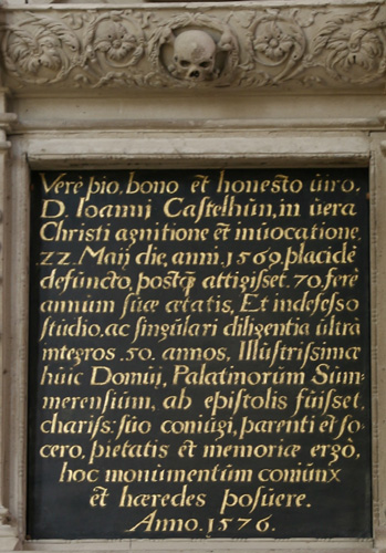 Die große Inschrift im Zentralfeld in humanistischer Minuskel lautet: "Vere pio, bono et honesto uiro, / D(omino) Ioanni Castelhun, in vera / Christi agnitione et invocatione, / 22. Maij die, anni 1569 placide / defuncto, postq(uam) attigisset 70 fere / annum suae aetatis, Et indefesso / studio, ac singulari diligentia ultra / integros 50 annos, Illustrissimae / huic Domui, Palatinorum Sum=/merensiuma), ab epistolis fuisset, / chariss(imo) suo coniugi, parenti et so=/cero, pietatis et memoriae ergo, / hoc monumentum coniunx / et haeredes posuere. / Anno 1576" - Dem wahrhaftig frommen, guten und ehrlichen Manne, Herrn Johannes Castelhun, der in wahrer Erkenntnis und Anrufung Christi am 22. Mai des Jahres 1569 sanft entschlafen ist, nachdem er beinahe das 70. Jahr seines Lebens erreicht und mit unermüdlichem Eifer und außerordentlichem Fleiß über volle fünfzig Jahre diesem durchlauchtigsten Haus der Pfalzgrafen von Simmern als Sekretär gedient hatte, ihrem teuersten Gatten, Vater und Schwiegervater, haben seine Gattin und die Erben aus Liebe und zum Gedächtnis im Jahr 1576 dieses Denkmal setzen lassen. Und die kleine Inschrift in Fraktur mit Kapitalis zitiert die Heilige Schrift: "Wa(h)rlich Wa(h)rlich sage ich euch, so iemandt / mein wort wirdt halten, der wirdt denn / Todt ni(ch)t sehen ewigklich. IOAN(NEM) 8. CAP(ITEL)".