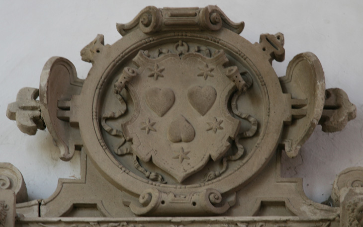 Das Wappen ist nicht in den Standardsammlungen enthalten. Es zeigt drei (2:1) Herzen, das untere gestürzt, begleitet von fünf (2:2:1) sechszackigen Sternen. Die Tinkturen und ein evtl. geführtes Kleinod sind nicht bekannt. Der Verstorbene wird in zeitgenössischen Dokumenten 1542 als Kanzleischreiber und Registrator bezeichnet. Neben dem eigenen Wappen ist kein Hinweis auf die Abstammung gegeben, weder textlich noch heraldisch. Wahrscheinlich handelt es sich um einen Sohn von Johann von Kestelun, Trarbacher Landschreiber und Rentmeister. Jakob von Castelhun, kurpfälzischer Zinsmeister und Landschreiber zu Kreuznach, war wohl ein Sohn des hier in Simmern Bestatteten. Die Nachkommen der Castelhun lassen sich im 18. Jh. im Gebiet Nordrhein nachweisen.