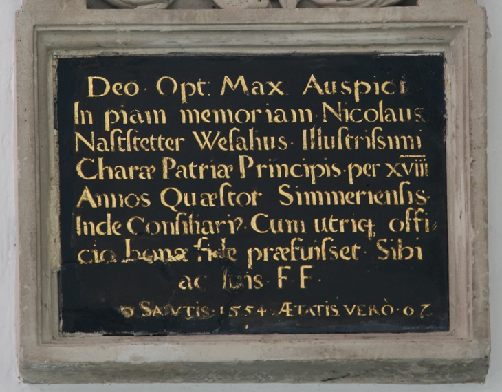 Über Nikolaus Nastätter ist nur bekannt, daß die Familie seit dem 15. Jahrhundert in Oberwesel nachweisbar ist, daß er sich am 7.11.1507 an der Universität Heidelberg immatrikulierte, daß er 1524 in Oberwesel als Schöffe auftritt, daß er ab den 1530er Jahren in den Dienst Herzog Johanns II. von Pfalz-Simmern trat und das Landschreiberamt und andere Ämter ausübte. Er wurde sogar pfalz-simmernscher Hofrat und bekam 1557 ein Mannlehen des Markgrafen Philibert von Baden. Offensichtlich wollte er mit dieser Memorialtafel auf dem Höhepunkt seiner Karriere hier seinen Platz unter den anderen Hofbeamten in der Kirche sichern, solange es noch ging. Und in der Tat ist das das einzige Denkmal seiner Familie, es gibt weder für ihn, der hochbetagt 1566 starb, noch für seine Angehörigen Epitaphien oder Grabplatten. Sein Sohn war Johann Nastätter, Schaffner zu Ravengiersburg, und er konnte seinem Vater 1566 auf dem genannten Mannlehen nachfolgen.