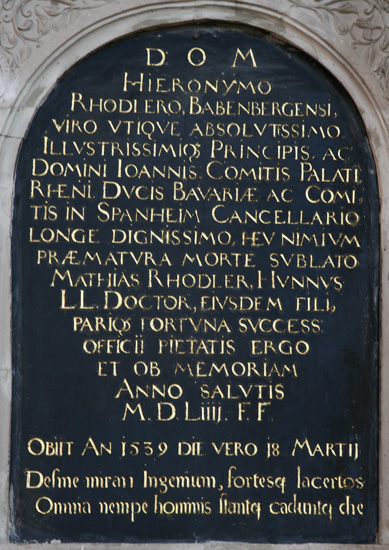 Die 18 Zeilen lange Grabinschrift ist in goldener Kapitalis ausgeführt und lautet "D(EO) O(PTIMO) M(AXIMO) / HIERONYMO / RHODLERO, BABENBERGENSI, / VIRO VTIQVE ABSOLVTISSIMO / ILLVSTRISSIMIQ(VE) PRINCIPIS, AC / DOMINI IOANNIS, COMITIS PALATI(NI) / RHENI, DVCIS BAVARIAE AC COMI=/TIS IN SPANHEIM CANCELLARIO / LONGE DIGNISSIMO, HEV NIMIVM / PRAEMATVRA MORTE SVBLATO / MATHIAS RHODLER, HVNNVS / LL(EGVM VTRIVSQVE) DOCTOR, EIVSDEM FILI(VS) / PARIQ(VE) FORTVNA SVCCESS(OR) / OFFICII PIETATIS ERGO / ET OB MEMORIAM / ANNO SALVTIS / M. D. LIIII. F(IERI) F(ECIT) / OBIIT AN(NO) 1539 DIE VERO 18 MARTII" - Dem allergrößten und besten Gott und dem aus Bamberg stammenden Hieronymus Rhodler, dem nahezu vollkommenen Manne, des durchlauchtigsten Fürsten und Herrn, Johannes Pfalzgraf bei Rhein, Herzog von Bayern und Graf von Sponheim, bei weitem verdientesten Kanzler, der, oh weh, durch einen zu vorzeitigen Tod hinweggerafft wurde, hat sein Sohn Matthias Rhodler, aus dem Hunsrück stammend, Doktor beider Rechte, durch gleiches Schicksal (seines Vaters) Amtsnachfolger, (dieses Epitaph) aus frommer Verpflichtung und zum Gedächtnis im Jahr des Heils 1554 anfertigen lassen. Er starb jedoch wirklich bereits im Jahr 1539 am 18. März. Hier wird die Abkürzung "LL" benutzt, um anzuzeigen, daß der Betreffende Doktor des weltlichen und des kirchlichen Rechts war, also Dr. iuris utriusque war, die damals übliche Form. Auch heute noch ist die Abkürzung "LL.D." in den angelsächsischen Ländern für den entsprechenden Abschluß üblich. Der Sohn, der dieses Epitaph stiftete, tat dies jedoch erst 15 Jahre später. Unten folgt auf dem Zentralfeld noch eine zweite Inschrift in Humanistischer Minuskel und in der Form eines Distichons: "Desine mirari Ingenium, fortesq(ue) lacertos / Omnia nempe hominis stantq(ue) caduntq(ue) die" - hör auf damit, Talent und starke Kräfte zu bewundern, alles dem Menschen Eigene steht und fällt nämlich doch irgendwann an einem Tag.