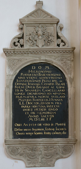 Dieses Epitaph ist ein zweites für die Familie Rhodler, nach dem zuletzt vorgestellten Enkel ist das hier für den zugehörigen Großvater, Hieronymus Rhodler (-18.3.1539). Das 1,92 m hohe und 0,82 m breite Grabdenkmal ist an der Südwand des Chors angebracht, wo sich auch die ganzen anderen Epitaphien der Beamtenfamilien der pfalzgräflichen Landesherrschaft befinden. Vom Material her folgt dieses Epitaph dem einschlägigen Prinzip, Hauptmaterial Tuffstein für alle Reliefarbeiten und den Rahmen, Zweitmaterial schwarzer Schiefer für die Inschriftenzonen. Anders ist hier der Aufbau mit einer Rundbogenarkade im Hauptfeld, und die von den anderen Epitaphien her vertrauten seitlichen Pilaster fehlen. Gleichwohl haben wir hier einen dreizonigen Aufbau, mit einem geschweiften Unterhang mit einer Satyr-Darstellung im Relief zwischen manieristischer, flächenfüllender Ranken-Ornamentik und mit einem mehrteiligen Aufbau, der von unten nach oben aus einer rechteckigen Wappentafel besteht, die seitlich von zwei S-förmigen Akanthusvoluten begleitet wird, um zur größeren Breite der Hauptzone überzuleiten, darüber einem dreieckiger Giebel mit einbeschriebener Muschelrosette, und darüber einem heute leeren Postament, das als Abschluß vermutlich einmal eine verlorengegangene Figur trug. 1897 erfuhr das Epitaph, das einem nicht näher bekannten "Meister von Simmern" zugeschrieben wird, zusammen mit den anderen Grabdenkmälern eine Restaurierung durch den Stuttgarter Bildhauer Karl Wüst.