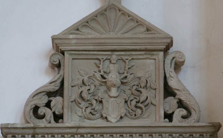 Im Aufsatz sehen wir das Wappen Rhodler, gespalten mit einem Hirschgeweih, auf dem Helm ein wachsender Mann zwischen zwei Hirschstangen, selbige mit seinen Händen erfassend, Tinkturen unbekannt. Das Wappen ist nicht in den einschlägigen Sammlungen enthalten, und auch bei Meyer wird es nach diesem Epitaph ohne Tinkturen verzeichnet. Was wissen wir über das Leben dieses Mannes, der lt. Inschrift aus Bamberg kam und die Familie in den Hunsrück verpflanzte? Schon bald nach seinem Studium der Rechtswissenschaften und seiner Promotion trat er in den 1520er Jahren in die Dienste von Herzog Johann II. von Pfalz-Simmern, zunächst als Sekretär und Notar. Sie verstanden sich prächtig, und der Jurist wurde einer der vertrautesten Beamten und Berater des Herzogs und stieg ca. 1535 bis zum Kanzler des Fürstentums auf. Er war zudem Leiter der 1527-1535 bestehenden herzoglichen Offizin. 1527 bekam Hieronymus Rhodler ein kaiserliches Druckprivileg, und der umfassend wissenschaftlich gebildete Herzog Johann II. ließ für ihn neben seinem Schloß im sogenannten Roten Haus eine Druckerei einrichten, wo ab 1530 zahlreiche Werke gedruckt wurden, darunter das Perspektivbuch, eine vereinfachte Variante von Dürers Arbeiten zu dem Thema, verfaßt von Johann II. höchstselbst. Das war eine der ersten Druckereien des Rheinlands. Hier wurde sowohl Gebrauchs- als auch Unterhaltungsliteratur gedruckt. 1530 erhielt Hieronymus Rhodler drei Weinberge im Bopparder Hamm als Lehen, Belohnung für sein Engagement und seine Verdienste für das Fürstentum. Als er starb, waren seine drei Söhne Matthias, Peter und Franz Rhodler noch minderjährig. Matthias, nach seinem Studium in Heidelberg und Marburg ebenfalls ein promovierter Jurist, sollte ihm später ab 1550 im Amt als Kanzler nachfolgen, und für dessen Sohn Johann Stephan Rhodler gibt es in der Kirche ebenfalls ein Epitaph.
