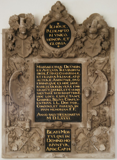 Rekonstruieren wir die Genealogie dieses Epitaphs: Margaretha Deung (-15.4.1581) war die Tochter von Paul(inus) Deung (andere Schreibweisen: Deungen, Duynken, Duyngin), Gerichtsschöffe und Landrentmeister in Trier, und dessen Frau, Anna Sirck (diese ist uns bereits aufgrund ihrer anderen, zweiten, 1553 geschlossenen Ehe mit Otto Seel, pfalz-simmernscher Regierungsrat, begegnet, weiterhin war deren Tochter mit Dr. Johann Stephan Rhodler verheiratet). Margaretha Deung war vermählt mit Dr. iur. utr. Gabriel Seel (-30.1.1596), ein aus Koblenz stammender und in Padua und Orléans studierter Regierungsrat am Hof von Herzog Reichard von Pfalz-Simmern (Gabriel war übrigens vermutlich ein Sohn des genannten Otto Seel und damit der Bruder der Ehefrau des Dr. Johann Stephan Rhodler), der 1569 Herzog Wolfgang von Pfalz-Zweibrücken auf seinem Frankreichfeldzug begleitete. Aus der Ehe entsprossen vier Kinder. Es gab einen Sohn, Georg Seel, eine Tochter namens Anna Maria, vermählt mit dem Augsburger Juristen Georg Rehm, eine zweite Tochter namens Juliane, und die Umstände, daß das vierte Kind noch keinen Namen hatte, sprechen dafür, daß es eine Totgeburt war und die Mutter an deren Folgen verstarb.