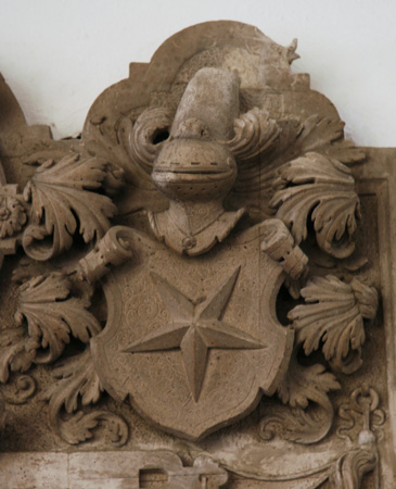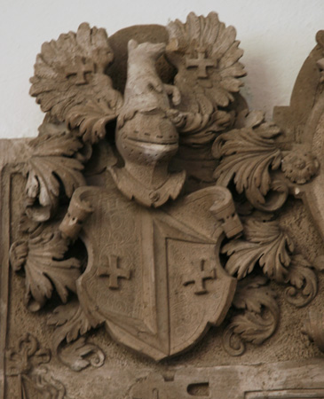 Das Epitaph trägt zwei Vollwappen in den beiden oberen Ecken, jeweils raumgreifend über den Rand des Epitaphs ragend, heraldisch rechts das Wappen Seel, eine Wolfsangel, beseitet von zwei Tatzenkreuzen, auf dem Helm ein wachsender Hund oder Wolf zwischen einem Flug, Tinkturen unbekannt. Das Wappen Seel begegnet uns übrigens noch auf einem zweiten Epitaph in der Kirche, dort ist das Kleinod jedoch beschädigt. In Koblenz belegt Meyer das Wappen der Familie unter der Schreibweise Sehl, wo die Ratsherrenfamilie 1608 mit Stadtschreiber Dietrich Sehl erlosch. Heraldisch links ist das Wappen Deung angebracht, ein fünfzackiger Stern, auf dem Helm ein wachsendes, aufgrund der Zerstörung der oberen Partie nicht mehr nachvollziehbares und nicht näher bekanntes Objekt. Auch die Tinkturen sind mangels Verzeichnung in den heraldischen Standardwerken nicht bekannt. Bei Meyer finden wir unter der Schreibweise "Duyngin von Wittlich" wenigstens die Helmzier, das war ein wachsender Hirschrumpf. Meyer verweist darauf, daß das Wappen der Trierer Schöffenfamilie auf einer Tischplatte im städtischen Museum Trier zu sehen sei.