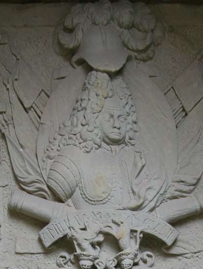 Porträtbüste des Verstorbenen in Harnisch und Allonge-Perücke