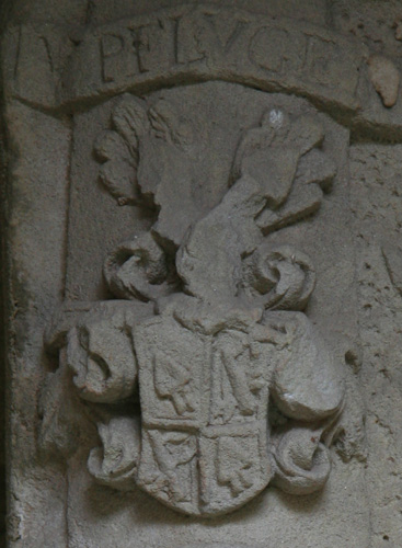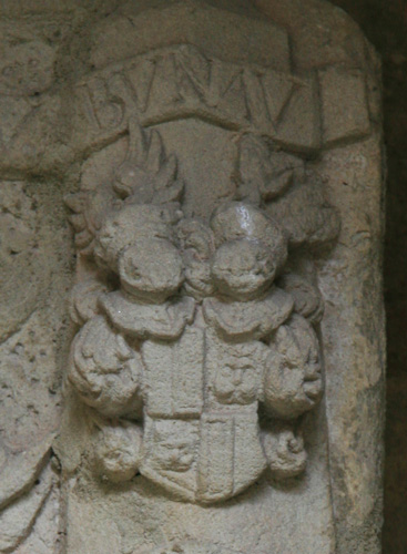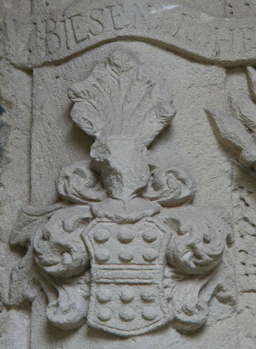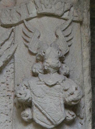 zentrales Wappenpaar mit einer stark abgekürzten Inschrift