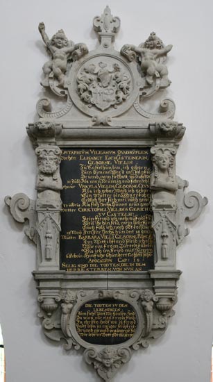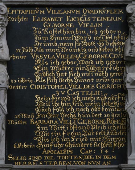 Die aus Kapitalis und Fraktur gemischte Hauptinschrift im Zentralfeld lautet: "EPITAPHIVM VILEANVM QVADRVPLEX / Tochter ELISABET EICHELSTEINERIN, / GEBORNE VIELIN, / Zu Castelhun bin ich gebor(e)n, / Zum Himmel Ward mei(ne) seel(e) erkor(en), / D(a)rumb na(h)m sie Gott vo(n) dieser Welt, / 17 July Als man Neüntzig und sieben z(a)ehlt / Schnur VRSVLA VIELIN, GEBOR(E)NE CLVSI(N) / Als ich gebar, Ward ich gebor(e)n / Ein(e) Mutter vi(e)r Söhn(e) erkohr(e)n / Endlich hat sich mei(ne) noth gewe(n)d(et), / 31 (decem)bris Als sich Sechs Hun(d)ert neun geend(et). / Vatter CHRISTOPHEL VIEL, DES GERICHTS / ZV CASTELH(VN) / Kein(e) frewd(e) ich mehr auf erde(n) fi(n)d(e), / Weil ihr hin seid, mein(e) liebe(n) Kind(er). / Euch folg(e) ich, nach v(n)dt kom(me) zu(r) ruh(e) / 28 May Jm Ja(h)r Sechs hundert 10 darzu / Mutter BARBARA VIELI(N) GEBORNE RÖMERI(N) / Jm Wittibstand Pleib(e) ich allei(ne) / Wie ein from(mes) Turteltäübelei(n) / Bis ich im Fried(en) mit Simeon / 6 Febru(arii) Hinfuhr 6hundert achze(h)n scho(n)." Darunter folgt noch "APOCALYPS CAP: 14 / SELIG SIND DIE TODTEN, DIE IN DEM / HERRE(N) STERBEN, VON NVN AN". Bei dieser Inschrift sind erklärungsbedürftig a) die erste Zeile lautet übersetzt: "vierfältiges Epitaph der Viel", b) eine "Schnur" ist eine Schwiegertochter, c) Mutter Barbara wird als geborene Römerin bezeichnet, das ist unzutreffend, sie war eine geborene Bäcker gen. Schmiedebecker, und vielmehr war ihre Mutter eine geborene Römer, da wurde eine Generation übersprungen, d) auffallend sind die Daten, die dafür sprechen, daß Elisabeth Viel und Ursula Clausen beide im Wochenbett starben, und e) die meisten der jung verstorbenen Kinder werden pauschal unter "liebe Kinder" aufsummiert, lediglich die verheiratete Elisabeth bekommt eine eigene Erwähnung.