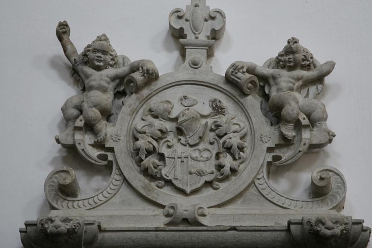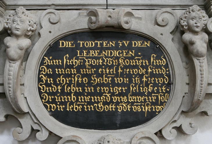 Eine letzte Inschrift unten in der ovalen Kartusche wird von zwei Hermen flankiert und lautet: "DIE TODTEN ZV DEN / LEBENDIGEN / Zum sicher(en) port Wir (ge)kom(m)en sind / Da man nür eitel frewde find(et): / Jn christo Habe(n) wir (je)itz(t) frewd / Vndt leb(e)n in ewiger seligkeit / Drumb niema(n)d vns beweine(n) soll / Wir lebe(n) in Gott v(n)dt v(n)s ist wo(h)l". Überblick über die Genealogie der Familie unter Hervorhebung der Personen, an die dieses Epitaph erinnert:
