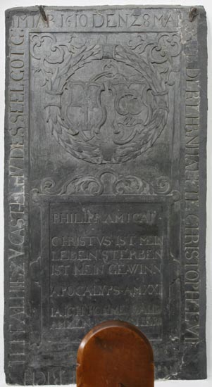 Für Christoph Viel gibt es auch noch eine Grabplatte. Sie ist an der Südwestseite des Langhauses angebracht, etwa in Höhe des dritten Seitenschiffsjochs, von Südosten gerechnet. Die 1,65 m hohe und 0,90 m breite Schiefertafel trägt folgende Kapitalis-Inschrift auf dem Rand umlaufend: "IM IA(H)R 1610 DEN 28 MAII / (ST)ARB DER EHR(E)NHAFFTE CHRISTOPHEL VI(EL / BV)RGER VND GERICH(/TSC)H(O)EFF(E) ALHIE(R) ZV CASTELHV(N) DES(SEN) SEEL(E) GOT(T) G(NADE)" und zusätzlich im unteren Bereich des Zentralfeldes die Bibelstellen "PHILIPP: AM I CAP / CHRISTVS IST MEIN / LEBEN : STERBEN / IST MEIN GEWINN // APOCALYPS AM XXII / IA ICH KOMME BALD / AMMEN IA KOMM HERR / IESV". Hier sehen wir die gleichen Wappen Viel und Bäcker gen. Schmiedebecker wie auf dem Epitaph, aber auf zwei Schilde verteilt und von einem Lorbeerkranz umgeben.