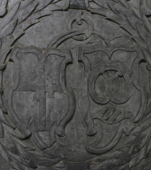 Das Wappen im Aufsatz ist ein Ehewappen, das dasjenige des Ehemannes und dasjenige der Ehefrau in einem gespaltenen Schild vereint. Beide Wappen sind typisch bürgerliche Wappen. Das Schildbild der Familie Viel zeigt eine Hausmarke, bestehend aus einem Vierkopfschaft mit gekreuzter freier Endung und mit einer vorderen Abstrebe; die Tinkturen sind unbekannt. Das Wappen der Familie Bäcker gen. Schmiedebecker ist ein redendes, das vom namengebenden Beruf abgeleitet ist, eine liegende Brezel über einem mehrfach schräg eingeritzten und an den Enden kugelförmig geformten Brötchen.
