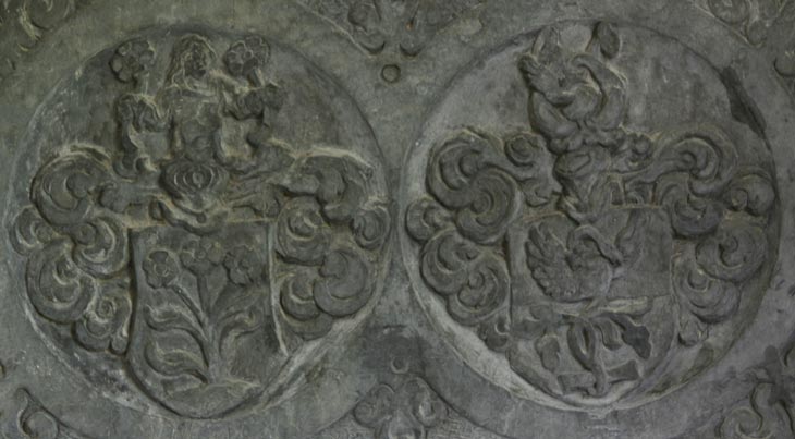 Die beiden Wappen des Ehepaares sind typisch bürgerliche Wappen, das Wappen Orth zeigt auf einem Hügel einen blühenden Rosenbusch mit Blättern und drei Blüten, auf dem Helm eine wachsende Jungfrau mit offenem Haar, in jeder ihrer ausgestreckten Hände eine gestielte Rosenblüte haltend, und das Wappen Weis ist geteilt, oben ein aus der Teilung wachsender Schwan mit gekrümmtem Hals und erhobenen Flügeln, unten ein liegender Ast mit einem von unten nach oben wachsenden Ast, dessen sich überkreuzende Zweige je eine Eichel tragen, auf dem Helm der auffliegende Schwan aus dem Schild zwischen zwei Büffelhörnern.