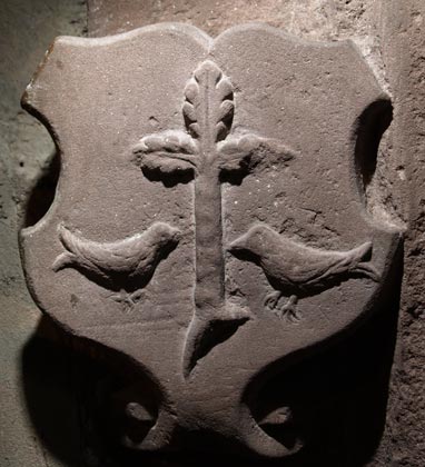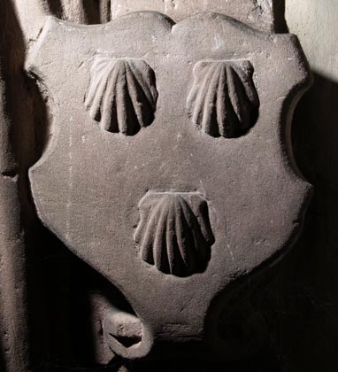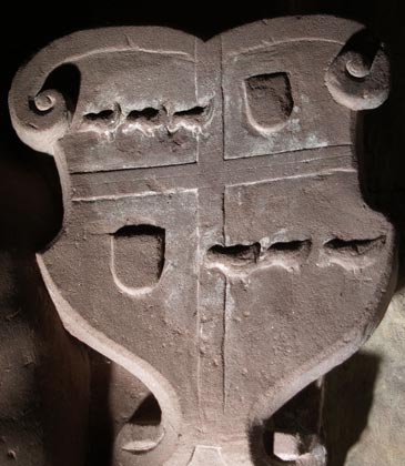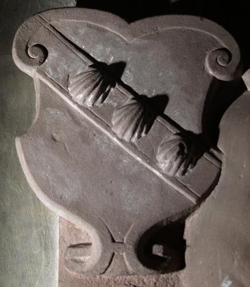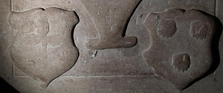 Die gleichen vier Wappenschilde in identischer Anordnung sind auf der zugehörigen Grabplatte zu sehen, deren Inschrift lautet: "HIE(R) LIEGT BEGRAB=/EN DIE EDLE VND / EHRENTVGENTREI=/CHE ELISABETA VON / HUY FRAW ZV ELTZ / CLERF WALMERING=/EN VND VNDRICH / WELCHE DEN 29. / TAG IVNY 1599 / IN GOT(T) ENT=/SCHLAFFE=/N DERO SE(E)L=/LEN DER AL(L)M=/(A)ECHTIG(E) GOT(T) / GNEDIG SE=/IN WOL(L)E / AMEN". In der allerletzten Zeile folgt ein Steinmetzzeichen. Oben rechts ist der Schrägbalken des Wappens de Heu noch zu erkennen; die Muscheln sind hingegen abgetreten (obige Abb. optisch links). Der Brandenbourg-Clervaux-Schild ist komplett bis zur Unkenntlichkeit abgetreten (obige Abb. optisch rechts). Der Schild der de Failly ist noch gut zu erkennen bis auf die Merletten (nachfolgende Abb. optisch links), und am besten erhalten ist der Schild mit den drei Pilgermuscheln (nachfolgende Abb. optisch rechts).