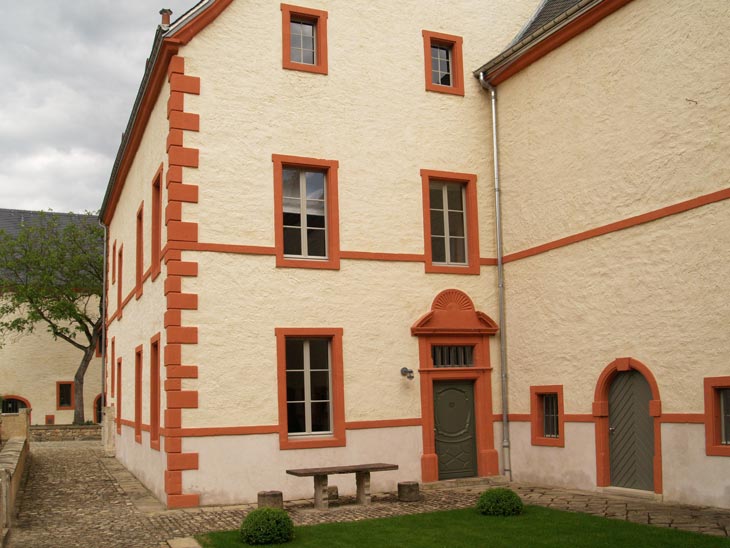 Vor dem Neubau befanden sich die Parzellen in Besitz von Dederich von Stein, Herr zu Nouville, der damals der drittgrößte Immobilienbesitzer im Ort war. Pierre-Ernest Schramm (-1732), Offizier, erst Vogt der Ortsherrschaft und bald selber einer der Ortsherren, war nicht nur dessen Nachbar, sondern auch ein aufstrebender Konkurrent als Immobilienbesitzer, und er sammelte durch Zukauf Grundstücke und Rechte, und er konnte schließlich die Parzellen am Tor hinzuerwerben. Bereits sein Vater hatte sich Grundstücke und Rechte im Ort gesichert. Die arrondierte Fläche nutzte der Käufer für einen ab 1725 errichteten Neubau, wobei bestehende Gebäudeteile nach Möglichkeit integriert wurden, so z. B. der Kernbau des großen Wirtschaftsgebäudes im Norden und eine Wand im Bereich der späteren Küche, wo noch Fenstergewände aus der Renaissance erhalten sind. Neu ist hingegen das lange Wohngebäude im Stil des frühen Barocks. Schramm ließ diesen Wohnbau mit Kreuzstockfenstern, mit Turm und Aborterker ausstatten, womit er typische Elemente der Herrschaftsarchitektur kopierte, wie es sie auch oben auf der Burg gab. Das entsprach seinem sozialen Status als einer der vier Herren der Herrschaft Larochette; die anderen drei waren die Familie Mohr von Wald, der Baron de Martial und die Familie de Stein; gemeinsam teilten sie sich die Herrschaft.