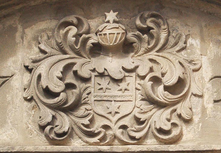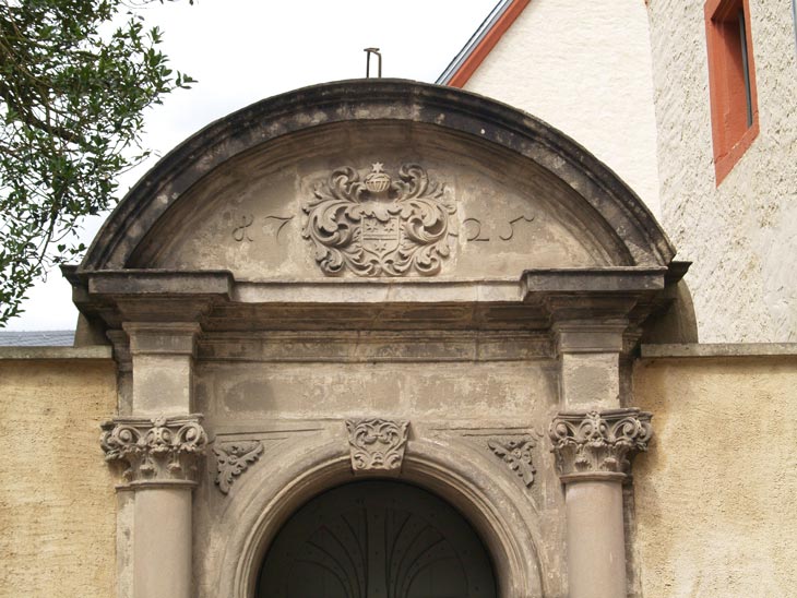 Das frühbarocke Hauptportal an der Rue de Mersch wird von zwei Halbsäulen mit Kompositkapitellen flankiert, die über dem Gebälk einen Segmentbogengiebel tragen. Das Wappen der Familie Schramm im Bogenfeld zeigt in Blau einen oben und unten gedornten goldenen Balken zwischen drei (2:1) sechszackigen silbernen Sternen (frz.: dazur à la fasce engreslée dor, accompagnée de trois étoiles à six rais d'argent), auf dem Helm ein sechszackiger silberner Stern (frz.: cimier: une étoile de lécu). Das Wappen ist weder im Rietstap noch im Siebmacher verzeichnet, nur im Loutsch. Das Wappen wird von der Jahreszahl 1725 begleitet. Die Holztür mit Rauten in vier Feldern ist noch bauzeitlich.
