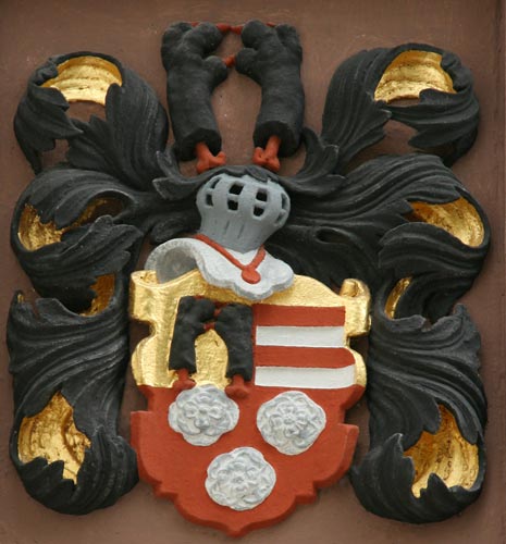 Abb.: Wappen am Abteigebäude in Gandersheim, auf der optisch linken Schmalseite des Erkers (vgl. Heraldik am Stift Gandersheim, Kleeblatt 2/2012, S. 36-49). Das Wappen ist Bestandteil einer Ahnenprobe von Äbtissin Anna Erika von Waldeck (17.9.1551-15.10.1611) und steht für ihre Großmutter Adelheid v. Hoya (-11.4.1513) bzw. ihren Urgroßvater Otto VII. Graf v. Hoya (-21.12.1494). Das Wappen ist halbgespalten und geteilt, Feld 1: in Gold zwei aufgerichtete, abgerissene, schwarze Bärentatzen mit roter Bewehrung (Stammwappen Hoya), Feld 2: rot-silbern dreimal geteilt (altes oldenburgisches Wappen, für Bruchhausen), Feld 3: in Rot drei (2:1) silberne Rosen (altes oldenburgisches Wappen der Wildeshauser Linie, für Bruchhausen), auf dem Helm mit schwarz-goldenen Decken die zwei schwarzen, ausgerissenen (man beachte hier die heraushängenden anatomischen Details!), rotbewehrten Bärentatzen wie in Feld 1 (Grafschaft Hoya, Stammkleinod). |