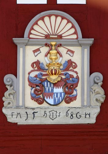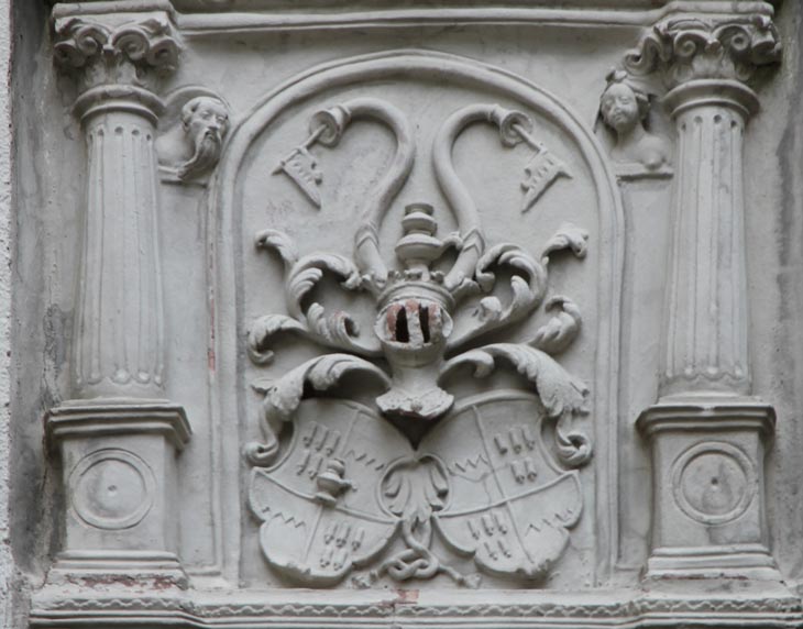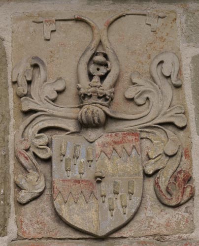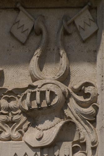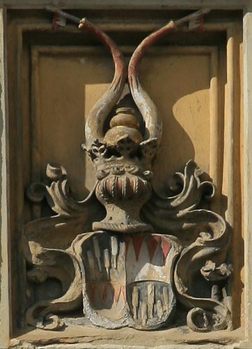 Wappentafel über dem stadtseitigen Zugang. Die Limpurger Wappen