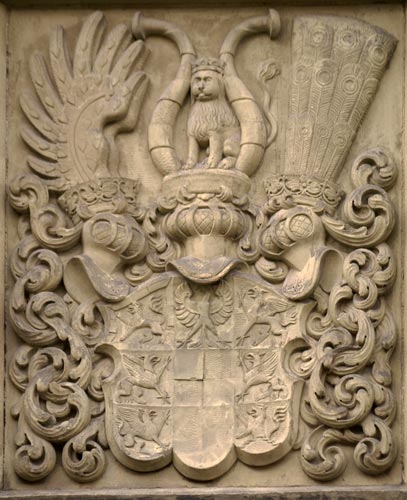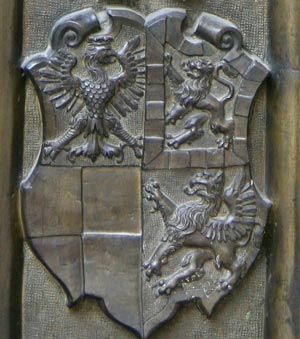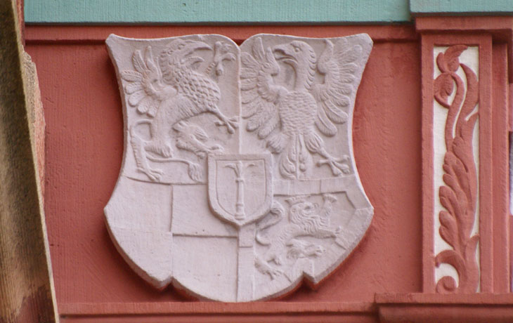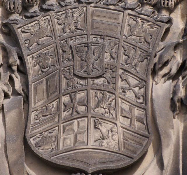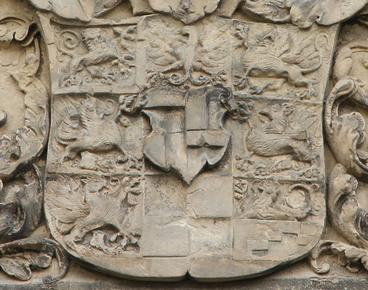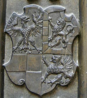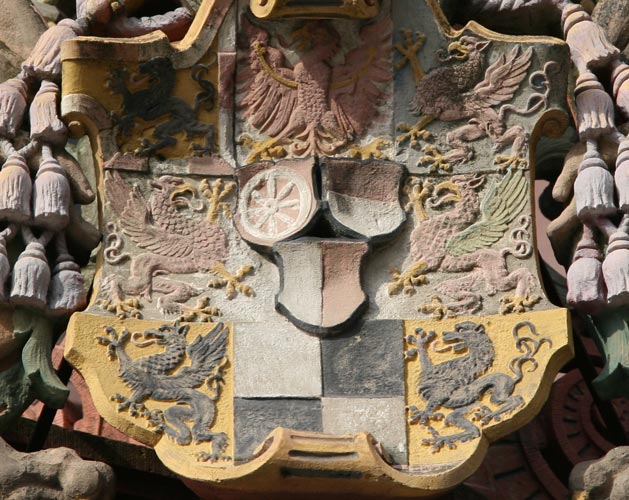 Das Wappen der Grafen von Zollern ist silbern-schwarz geviert. Das ist sozusagen die Keimzelle des gesamten Wappens, das Feld, das zuallererst da war, ehe weitere Inhalte hinzukamen, das alte Wappen der Edelfreien und seit ca. 1111 Grafen von Zollern, deren Stammländereien rund um die Burg Hohenzollern im Zollernalbkreis lagen und die sich ab Mitte des 14. Jh. von Hohenzollern nannten. Mit der Helmzier ist das eine komplexere Geschichte: Anfangs waren mehrere unterschiedliche Kleinode in Gebrauch (a) schwarz-silbern übereck geteilte Büffelhörner, b) ein schwarzes, mit goldenen gestürzten Lindenblättchen bestreutes und am oberen Rand mit Pfauenfedern bestecktes Schirmbrett). Burggraf Friedrich IV. von Nürnberg "kaufte" sich am 10.4.1317 eine neue Helmzier: Ein wachsender goldener Brackenrumpf mit roter Zunge und roten Ohren. "Vorbesitzer" war Leutold (Leupold) von Regensburg (Regensberg). Der Preis: 36 Mark Silber. Halt - hat das nicht eine erstaunliche Ähnlichkeit mit der Helmzier der Grafen von Oettingen? Richtig! Und die war älter. Entsprechend gab es auch ausgiebig Streit um die Helmzier. Wer die Kuriosität des goldenen Brackenhauptes sehen will, findet sie als Glasmalerei von 1380 in der Pfarrkirche St. Kilian in Markt Erlbach. Der Konflikt ging erst 1381 so aus, daß schließlich die Oettinger ihre Helmzier modifizierten: Die roten Ohren des Brackenrumpfes wurden mit einem Schragenkreuz belegt. Die Markgrafen tauchten ihren Bracken hingegen in die Farben ihres Stammwappens: Silbern-schwarz geviert. Ende gut, alles gut. Ab da gilt als Helmzier für das Stammwappen: auf dem Helm mit schwarz-silbernen Decken ein silbern-schwarz gevierter wachsender Brackenrumpf.