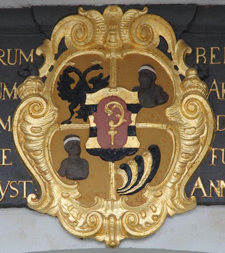 Schildhalter: Zwei Mohren, von denen der heraldisch rechte einen schräggerichteten Krummstab, der heraldisch linke ein schräggerichtetes Schwert hält. Das Wappen wird auch mit fürstlichem Wappenmantel und mit Fürstenhut dargestellt. Hinter dem Schild ein aufrechtes Kleeblattkreuz. Im Siebmacher Band Bistümer wird das Wappen mit Prunkstücken und mit oberhalb des Wappenmantels aufgereihten Helmen dargestellt.