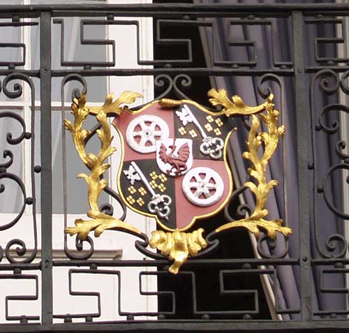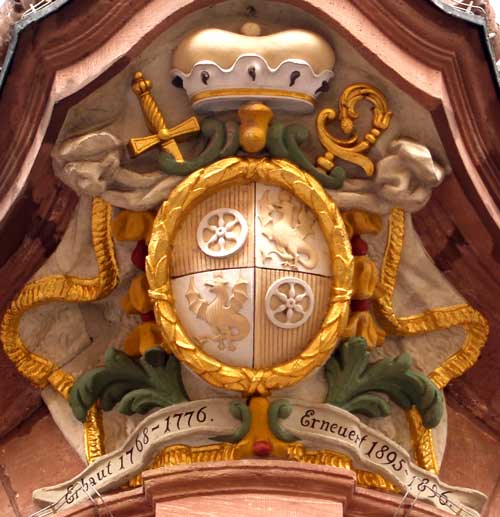 Das war wieder so ein "Ämter-Sammler" auf dem Mainzer Bischofsstuhl: Breslau (1683-1732), Worms (1694-1732), Fürstpropst von Ellwangen (1694-1732), Trier (1716-1729), später Mainz (1729-1732)- kaum zu glauben, daß er alle Ämter tatsächlich nicht nur innehatte, sondern auch ausübte. Und weil das anscheinend noch nicht genug war, kam noch die Würde des Hoch- und Deutschmeisters des Deutschen Ordens hinzu. Vielbeschäftigter Mann, bei dem man annehmen muß, daß seine Wappen eine höhere Präsenz zeigten als seine Person. Als Mainzer Fürsterzbischof hat er also alles im Wappen, was er im Laufe seines Lebens gesammelt hat, bis auf die Komponenten Trier und das damit verbundene Prüm, da er Trier für das reichspolitisch bedeutsamere Bistum Mainz aufgab.