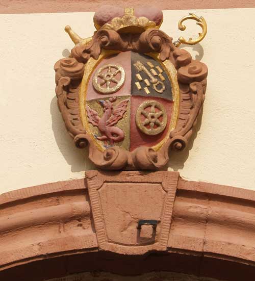 Das aufgelegte kleinste Schildchen zeigt in Rot ein silbernes sechs- bzw. achtspeichiges Rad, Erzstift Mainz.