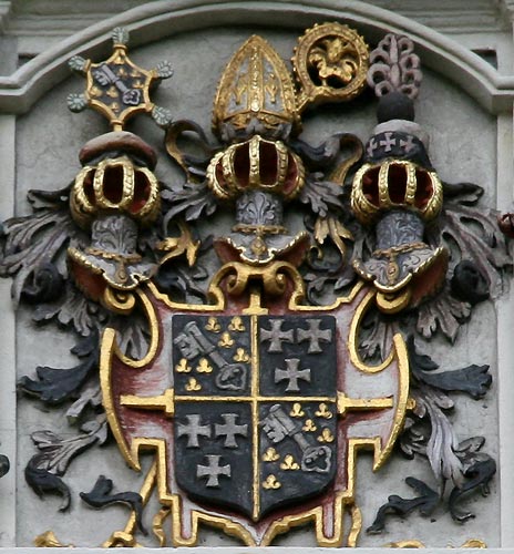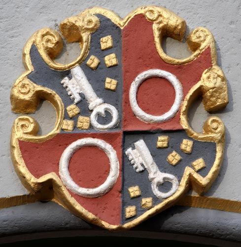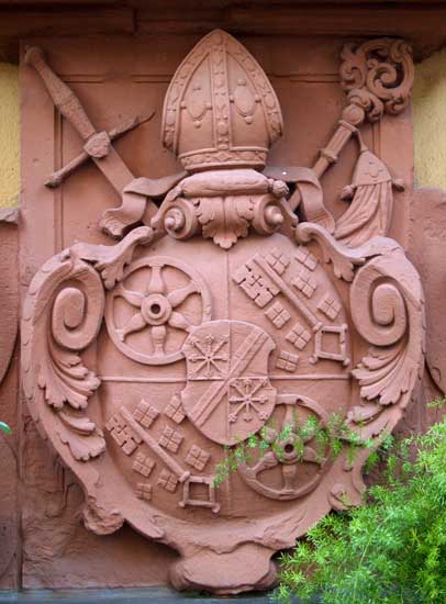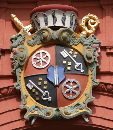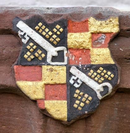 Bildbeispiel: gemaltes Wappen am Bischofshof in Ladenburg (mit farblichen Abweichungen bei den Decken)