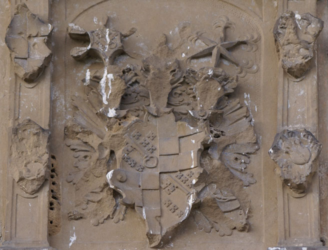 Abb.: Dirmstein, ehem. Schloß, östliche Außenseite des Amtshauses, Amtswappen des Philipp I. von Rodenstein (reg. 1595-21.3.1604) mit zwei Helmen und 4er-Ahnenprobe.